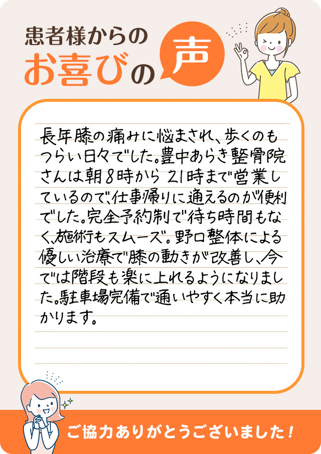 長年膝の痛みに悩まされ、歩くのもつらい日々でした。豊中あらき整骨院さんは朝8時から夜21時まで営業しているので、仕事帰りに通えるのが便利でした。完全予約制で待ち時間もなく、施術もスムーズ。野口整体による優しい治療で膝の動きが改善し、今では階段も楽に上れるようになりました。駐車場完備で通いやすく本当に助かります。