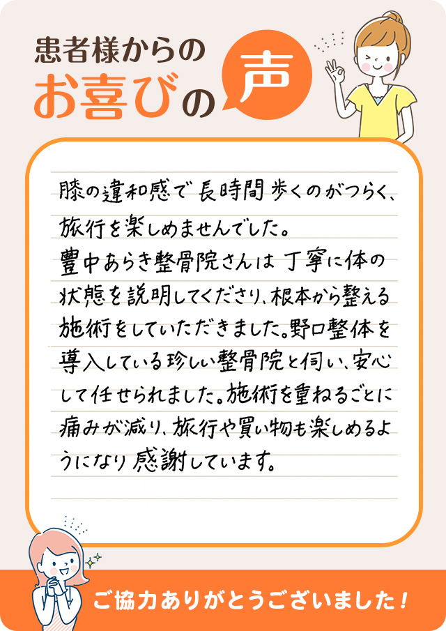 膝の違和感で長時間歩くのがつらく、旅行を楽しめませんでした。豊中あらき整骨院さんは丁寧に体の状態を説明してくださり、根本から整える施術をしていただきました。野口整体を導入している珍しい整骨院と伺い、安心して任せられました。施術を重ねるごとに痛みが減り、旅行や買い物も楽しめるようになり感謝しています。