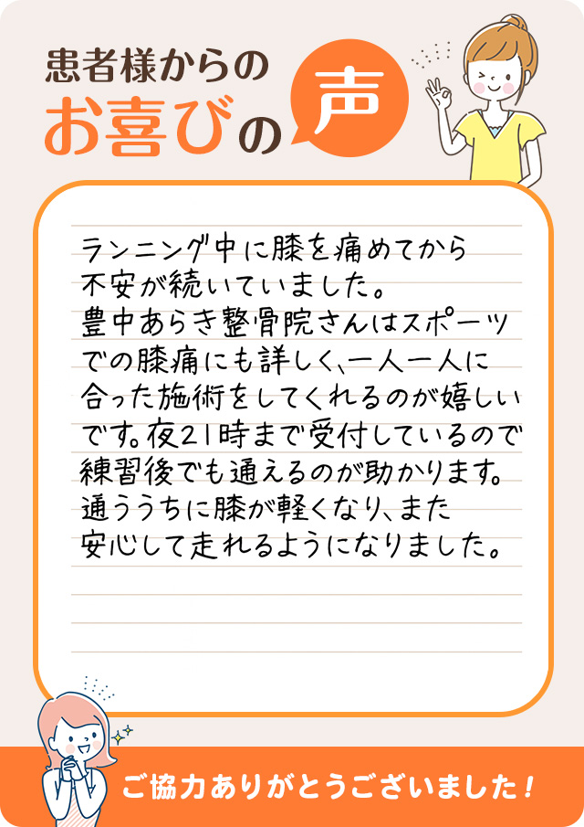 ランニング中に膝を痛めてから不安が続いていました。豊中あらき整骨院さんはスポーツでの膝痛にも詳しく、一人ひとりに合った施術をしてくれるのが嬉しいです。夜21時まで受付しているので練習後でも通えるのが助かります。通ううちに膝が軽くなり、また安心して走れるようになりました。