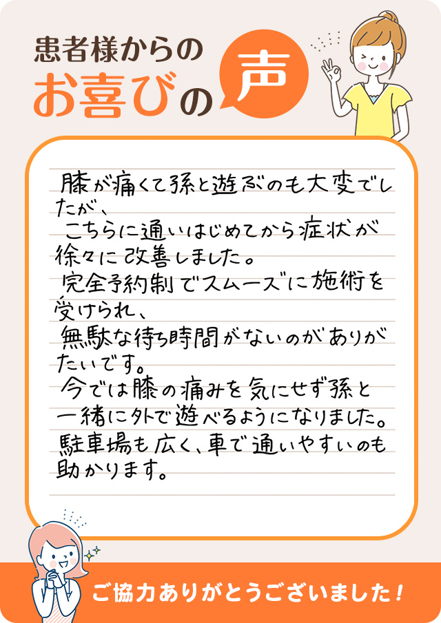 膝の痛みを気にせず孫と一緒に外で遊べるようになりました