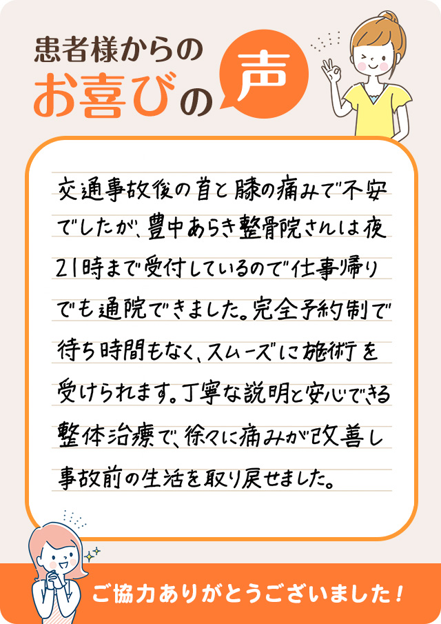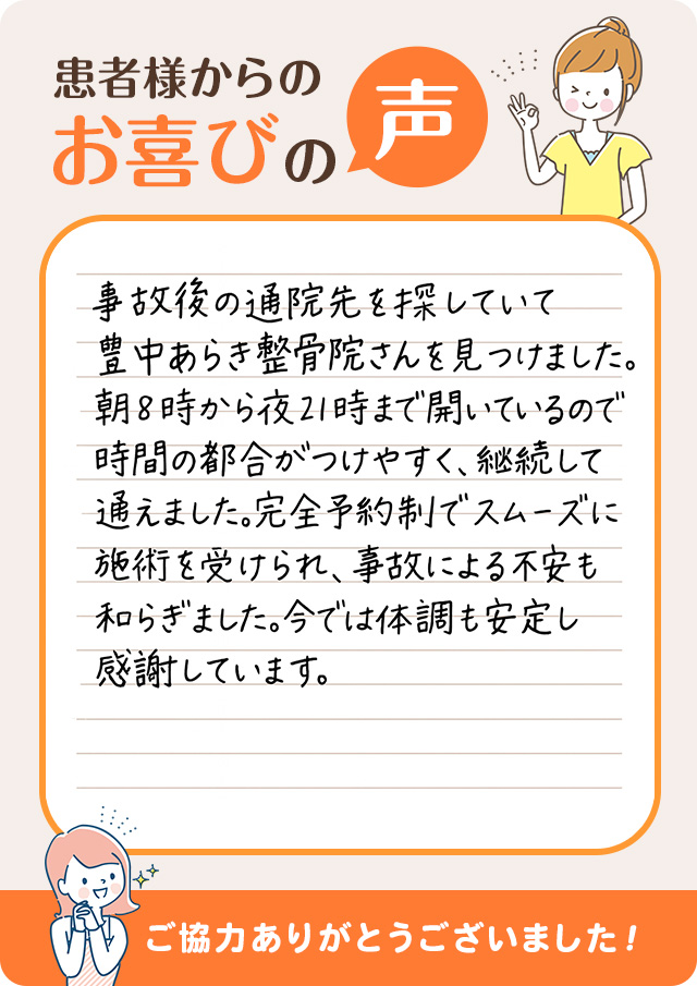 事故後の通院先を探していて豊中あらき整骨院さんを見つけました。朝8時から夜21時まで開いているので時間の都合がつけやすく、継続して通えました。完全予約制でスムーズに施術を受けられ、事故による不安も和らぎました。今では体調も安定し感謝しています。