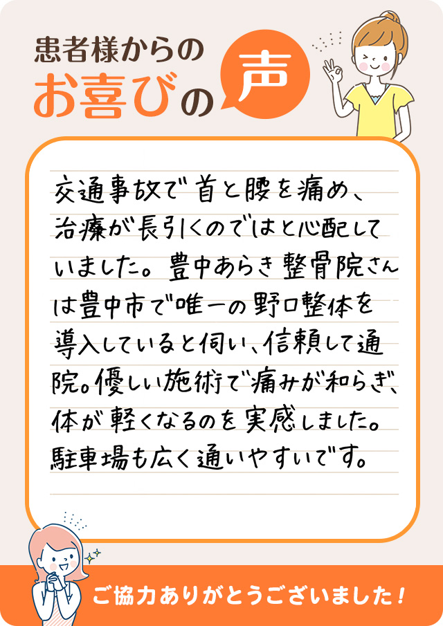 交通事故で首と腰を痛め、治療が長引くのではと心配していました。豊中あらき整骨院さんは豊中市で唯一の野口整体を導入していると伺い、信頼して通院。優しい施術で痛みが和らぎ、体が軽くなるのを実感しました。駐車場も広く通いやすいです。