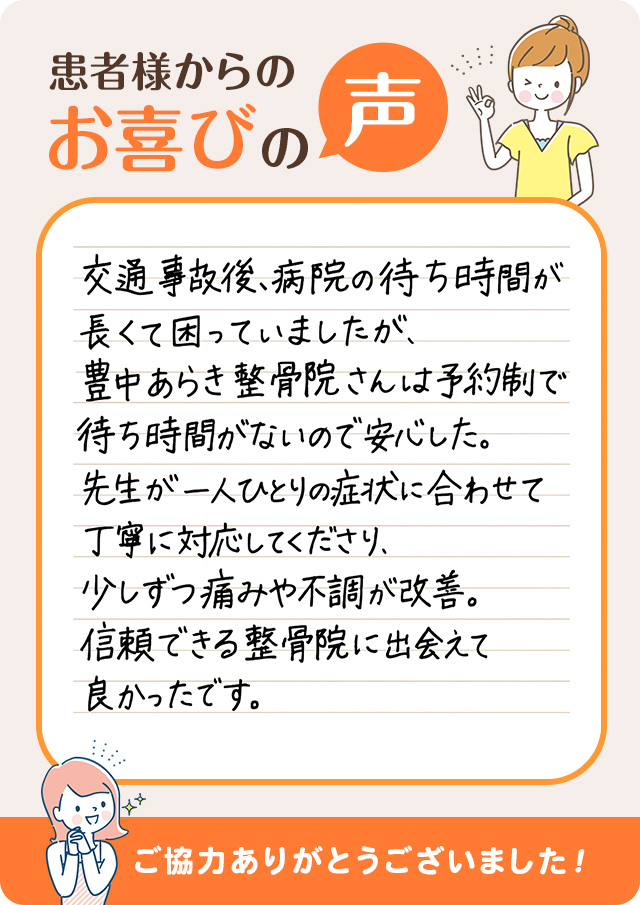 交通事故後、病院の待ち時間が長くて困っていましたが、豊中あらき整骨院さんは予約制で待ち時間がないので安心でした。先生が一人ひとりの症状に合わせて丁寧に対応してくださり、少しずつ痛みや不調が改善。信頼できる整骨院に出会えて良かったです。