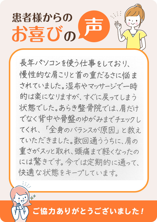 私は昔から肩こりがひどく、デスクワークということもあって、いつも辛かったです。運動もほとんどしませんでしたし、肩が固まりすぎていました。知り合いの人があらきさんに通っていて、試しに行ってみました。