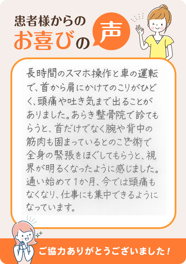 長時間のスマホ操作と車の運転で、首から肩にかけてのこりがひどく、頭痛や吐き気まで出ることがありました。あらき整骨院で診てもらうと、首だけでなく腕や背中の筋肉も固まっているとのこと。施術で全身の緊張をほぐしてもらうと、視界が明るくなったように感じました。通い始めて1か月、今では頭痛もなくなり、仕事にも集中できるようになっています。