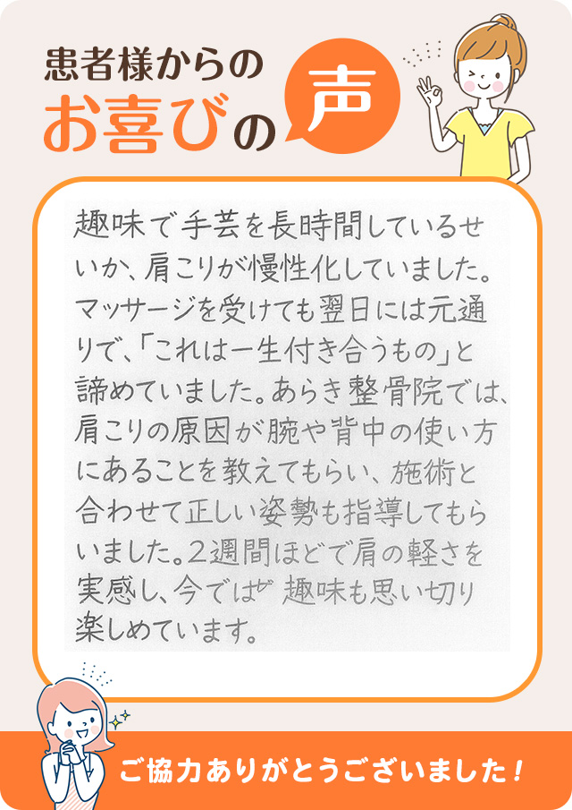 趣味で手芸を長時間しているせいか、肩こりが慢性化していました。マッサージを受けても翌日には元通りで、「これは一生付き合うもの」と諦めていました。あらき整骨院では、肩こりの原因が腕や背中の使い方にあることを教えてもらい、施術と合わせて正しい姿勢も指導してもらいました。2週間ほどで肩の軽さを実感し、今では趣味も思い切り楽しめています。