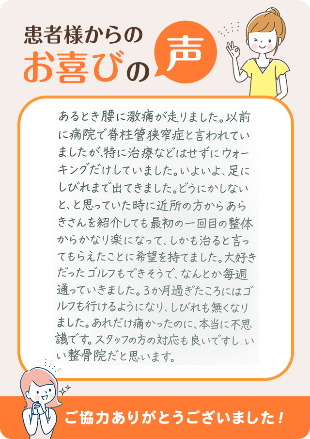 あるとき腰に激痛が走りました。 以前に病院で脊柱管狭窄症と言われていましたが、特に治療などはせずにウォーキングだけしていました。いよいよ、足にしびれまで出てきました。どうにかしないと、と思っていた時に近所の方からあらきさんを紹介してもらいました。最初の一回目の整体からかなり楽になって、しかも治ると言ってもらえたことに希望を持てました。大好きだったゴルフもできそうで、なんとか毎週通っていきました。3か月過ぎたころにはゴルフも行けるようになり、しびれも無くなりました。あれだけ痛かったのに、本当に不思議です。スタッフの方の対応も良いですし、いい整骨院だと思います。