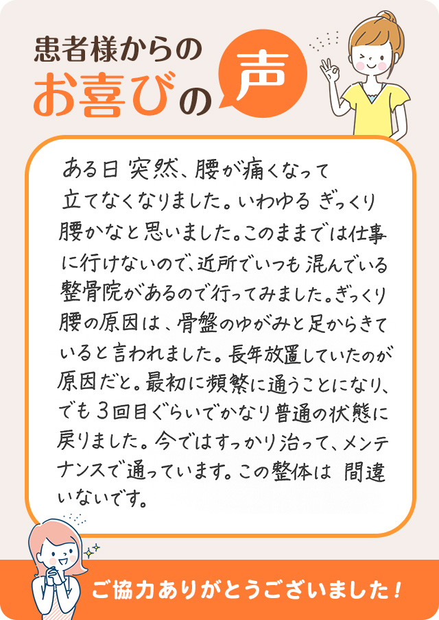 ある日突然、腰が痛くなって立てなくなりました。いわゆるぎっくり腰かなと思いました。このままでは仕事に行けないので、近所でいつも混んでいる整骨院があるので行ってみました。ぎっくり腰の原因は、骨盤のゆがみと足からきていると言われました。長年放置していたのが原因だと。最初に頻繁に通うことになり、でも3回目ぐらいでかなり普通の状態に戻りました。今ではすっかり治って、メンテナンスで通っています。この整体は間違いないです。