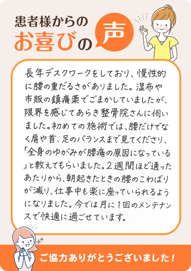 ずっと腰が痛くて整形外科でリハビリをしてもらっていたのですが、あまり進歩がなかったので、知人に教えてもらったあらき整骨院に行きました。丁寧にお話しを聞いてくださり、全身を治してもらえるとのことでした。とりあえず2ヵ月ぐらい通った時には、腰の痛みはほとんどなくなりました。本当にうれしかったです。普通に生活できることのありがたさ。感謝でいっぱいです。