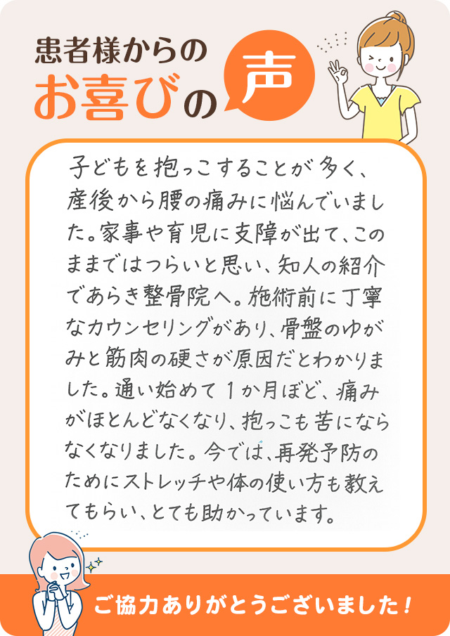 子どもを抱っこすることが多く、産後から腰の痛みに悩んでいました。家事や育児に支障が出て、このままではつらいと思い、知人の紹介であらき整骨院へ。施術前に丁寧なカウンセリングがあり、骨盤のゆがみと筋肉の硬さが原因だとわかりました。通い始めて1か月ほどで、痛みがほとんどなくなり、抱っこも苦にならなくなりました。今では、再発予防のためにストレッチや体の使い方も教えてもらい、とても助かっています。