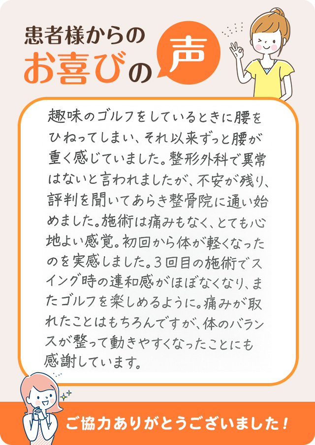 3回目の施術で違和感がほぼなくなり、またゴルフを楽しめるように