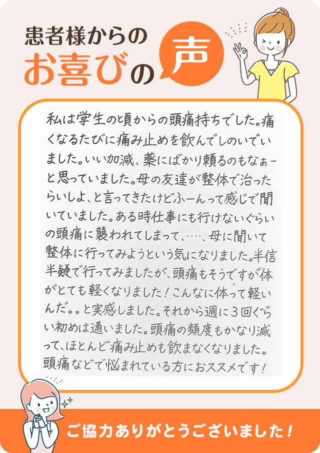 私は学生の頃からの頭痛持ちでした。痛くなるたびに痛み止めを飲んでしのいでいました。いい加減、薬にばかり頼るのもなぁーと思っていました。母の友達が整体で治ったらいしよ、と言ってきたけどふーんって感じで聞いていました。ある時仕事にも行けないぐらいの頭痛に襲われてしまって、、、母に聞いて整体に行ってみようという気になりました。半信半疑で行ってみましたが、頭痛もそうですが体がとても軽くなりました!こんなに体って軽いんだ。。と実感しました。それから週に3回ぐらい初めは通いました。頭痛の頻度もかなり減って、ほとんど痛み止めも飲まなくなりました。頭痛などで悩まれている方におススメです!